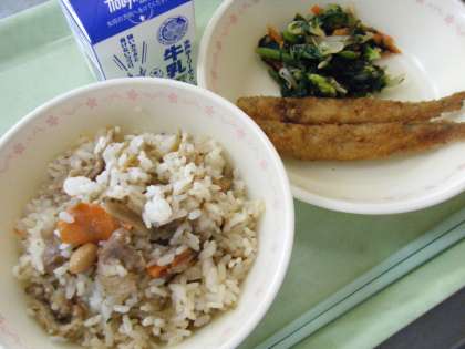 今日の献立は,きんぴらご飯,ししゃもフライ,磯香和え,牛乳です。
