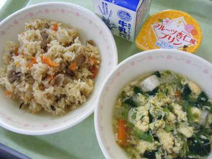 今日の献立は,炊き込み魯肉飯,紫菜蛋花湯,牛乳,杏仁豆腐です。