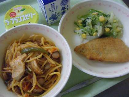 今日の献立は,スパゲッティナポリタン,アジフライ,コーンサラダ,牛乳,ラフランスゼリーです。