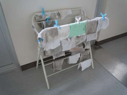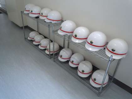 雑巾やヘルメットが整然と並べられています。モノが整理されていると心も整理されます。登校してカバンを置く、ヘルメットを置く。清掃後、雑巾をきちんとかける。そういう心を育てています。