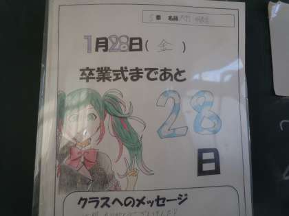 コロナ禍ではありますが、時間が止まることはありません。音楽室では卒業式に向けての合唱練習が行われ、3年生の教室には卒業までのカウントダウンカレンダーが掲示されています。