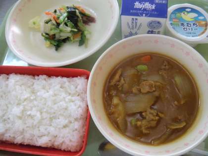 ご飯、ポークカレー、海藻サラダ、牛乳、すだちゼリーです。
