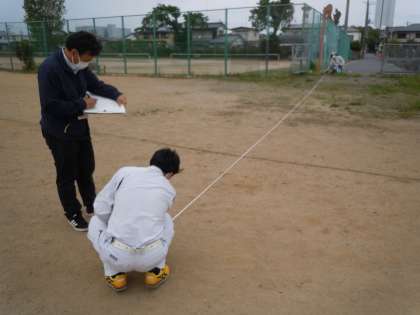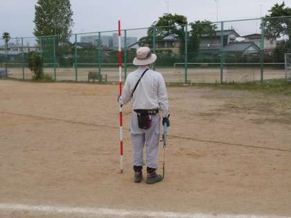 市の教育委員会の方と学校敷地の測定を行いました。ポイントを確認しながら、勝田二中ができる前の土地の様子について説明をうかがいました。