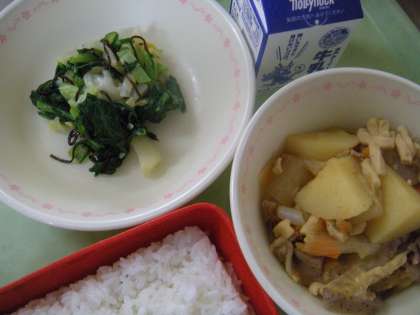 今日の和え物は、キャベツ、小松菜、きゅうりを塩昆布で和えた「昆布和え」です。