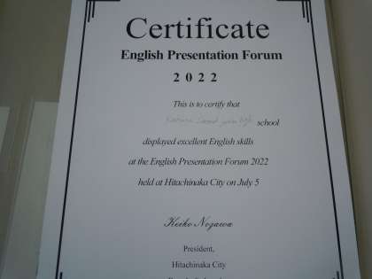 本日、英語プレゼンテーションフォーラムのひたちなか市大会が行われ、代表生徒5名が参加しました。結果、入賞し、来週15日(金)に水戸合同庁舎で行われる水戸地区大会に出場することになりました。おめでとうございます。