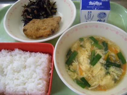 今日は減塩の日「いばらき美味しおDay」です。みそ味のフライと炒め煮が、どちらもしっかりした味付けなので、かきたま汁は出汁をきかせて、あっさりした味に仕上げました。ご飯とおかずを交互に食べるとちょうどよい味付けになっています。