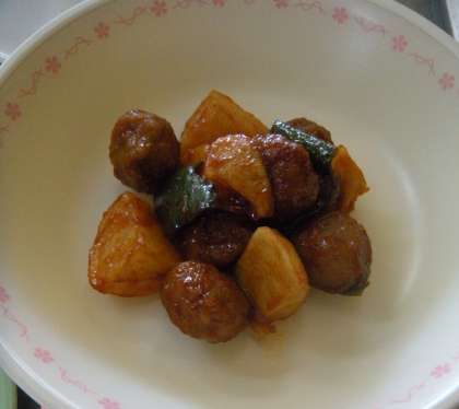 5 揚げたじゃが芋、ピーマン、肉団子を4のソースで和える。