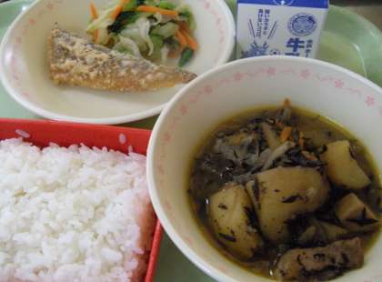 ひじきは生のままでは渋くて食べられないので、何時間もかけて茹でてから使います。黒い色のひじきですが、海の中では緑色です。他の海藻と同じように茹でてすぐは鮮やかな緑色に変化しますが、渋みをとるために長い時間をかけて茹でている間に、渋みの成分の影響で黒色に変わってしまうのです。