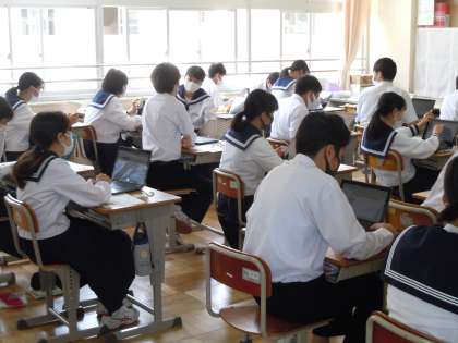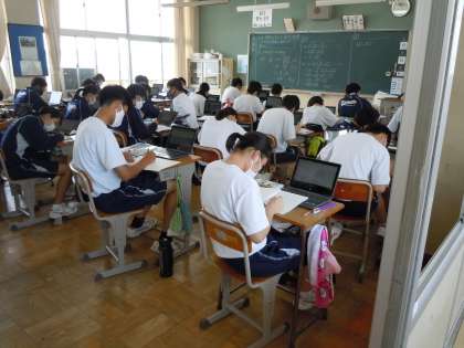 3年生の数学の授業と2年生の国語の授業でタブレットを活用していました。担当の教員が自作の教材をタブレットを通して生徒に配付します。生徒はその教材に解答して教員に戻す,という活用の仕方です。教員が自作の教材を作成するには時間と労力がかかりますが,生徒のためにと日々研鑽しております。