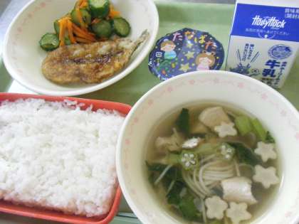 七夕は星祭とも呼ばれます。そこで給食では,天の川に見立てたそうめんと,星に見立てたおくらと麩を入れたすまし汁,星の形のゼリーを献立に取り入れました。