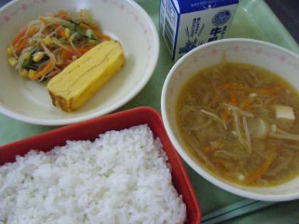 今日の献立は,ご飯,厚焼き玉子,春雨サラダ,もやしたっぷりごまみそ汁です。