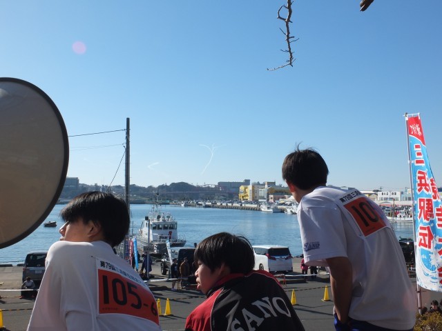 中継所から戻ってくる選手を待つ、その向こうに百里基地航空祭でのブルーインパルスの展示飛行が垣間見えたのも素敵な偶然でした。