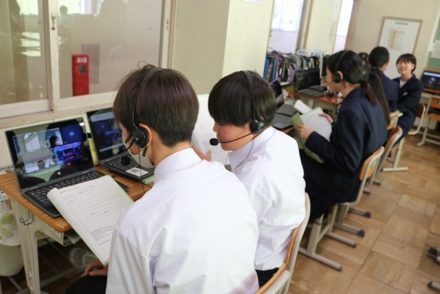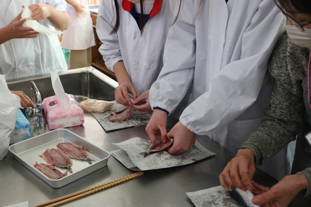 協議に先立っての授業参観では、1年生での他校とオンラインでつないで行っている英会話交流の様子や、市健康推進課と食生活改善推進員の協力による家庭科での「お魚食育体験」で子供たちがイワシを手開きしてつみれ汁を作っている様子を見ていただきました。