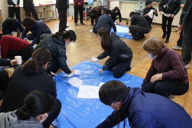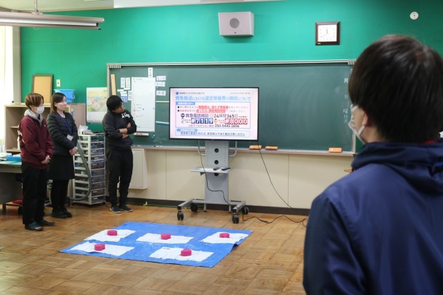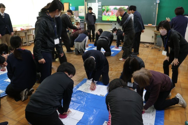 応急処置の研修では、救急車を要請する際の効率的な連絡の仕方、歯が折れたとき、鼻血の止め方、過呼吸を起こしたとき、嘔吐物の処理など、命に関わる場面や日常的に起こり得る場面での対応について実践的な研修を行いました。