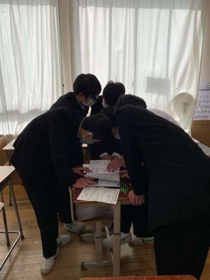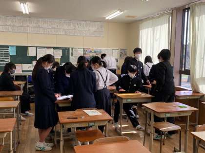 三年生は学年末テスト二日目です。テストの間には,友達同士で問題を出し合いながら最後の確認をしている様子が見られました。みんなで協力して,それぞれの目標に向かって最後まで頑張ってほしいと思います。