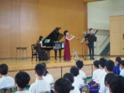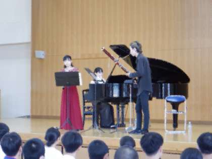 9月12日(火)、本校卒業生の先輩と先輩の仲間の3人の方が来校され、ファゴット、オーボエ、ピアノが奏でる素敵な音楽を聴かせてくださいました。美しい音色が体育館中に響き渡り、幸せな気持ちになりました。