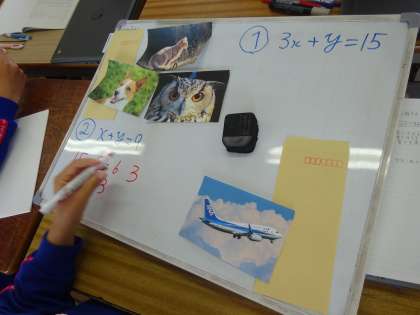 2年生の数学の授業で,連立方程式の単元です。写真は,具体物を用いて問題を読み解くようすです。