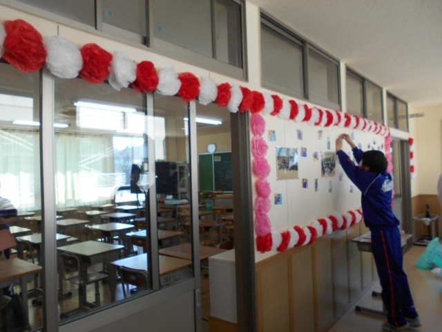写真は、1年生が卒業生の教室を掃除し、飾りつけをしている様子です。