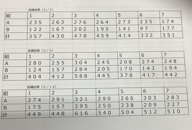 写真の結果は、5月7日、5月9日、5月16日の三回分の全体練習の結果です。昼休みもグラウンド