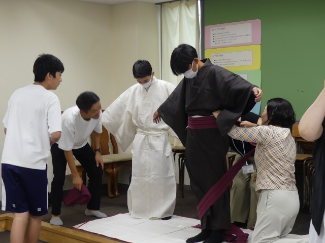 生徒は、講師の先生から、着物のたたみかたを教えていただいたり、浴衣を着付けていただいたりしながら、日本の伝統的な衣装について学びました。