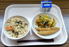 わかめ五目ごはん 牛乳 ししゃもフライ さつまいものガーリックサラダ
