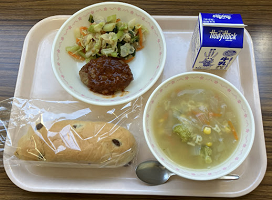レーズンパン 牛乳 ハンバーグデミグラスソース オニオンドレッシングサラダ ABCスープ