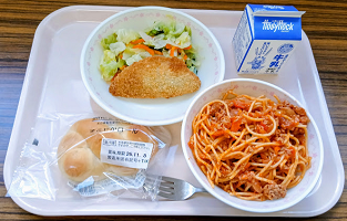 ミートソーススパゲッティ ミニロールパン 牛乳 アジフライ レモンドレッシングサラダ