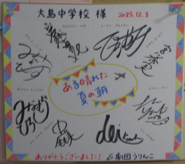 生徒たちは、登場人物たちの葛藤や感情の揺れ動きに真剣に見入っていました。今回の鑑賞会で得た感動や気づき、そして真剣に向き合う姿勢を、今後の学校生活や学習にも活かし、より豊かな人間性を育んでほしいと思います。サイン入り色紙もいただきました。