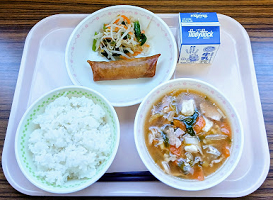 ごはん 牛乳 春巻き もやしサラダ キムチスープ