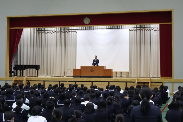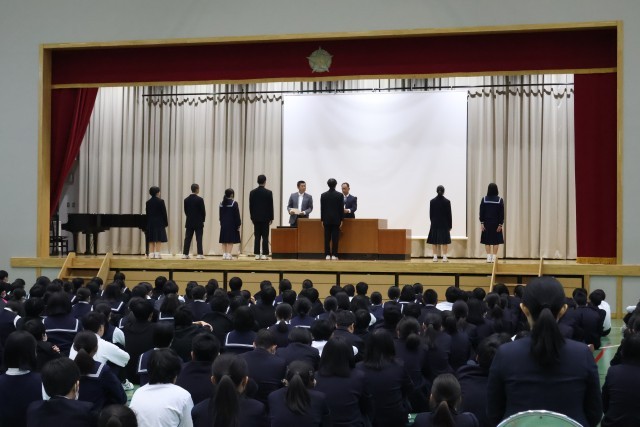 明日より冬季休業が始まります。本日3時間目に表彰や任命式、冬休みの過ごし方や生活上の注意について確認を行い、生徒は落ち着いた態度で話を聞いていました。健康と安全に十分気を付け、家族や地域との時間を大切にしながら、有意義な冬季休業を過ごしてほしいと思います。休業明けに、元気な姿で登校してくることを楽しみにしています。