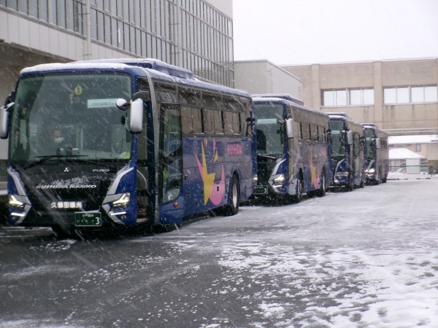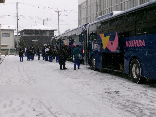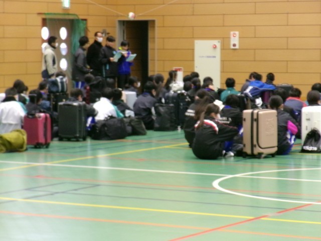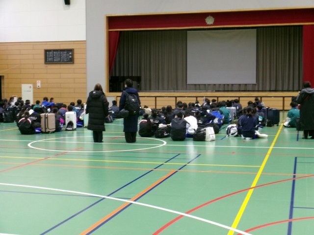 雪のため、体育館で出発式を行い予定どおり出発しました。