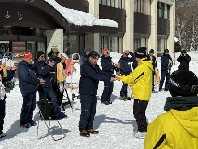 スキー講習が全て終了し、閉校式が行われました。インストラクターさんから、実行委員長へ修了証をいただきました。
