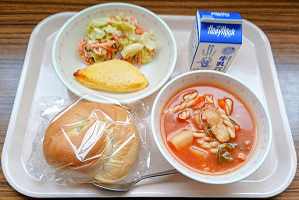 ミルクパン 牛乳 オムレツ シーザーサラダ 鶏肉とマカロニのトマトスープ