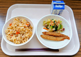 キムタクごはん 牛乳 ししゃもフライ さつまいも入りオニオンドレッシングサラダ