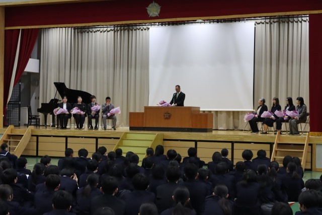 式では、離任される先生方お一人おひとりから、本校での思い出や生徒たちへの温かいメッセージをいただきました。 生徒たちは、先生方との授業や部活動、行事での日々を思い返し、真剣な眼差しで最後のお話に耳を傾けていました。
