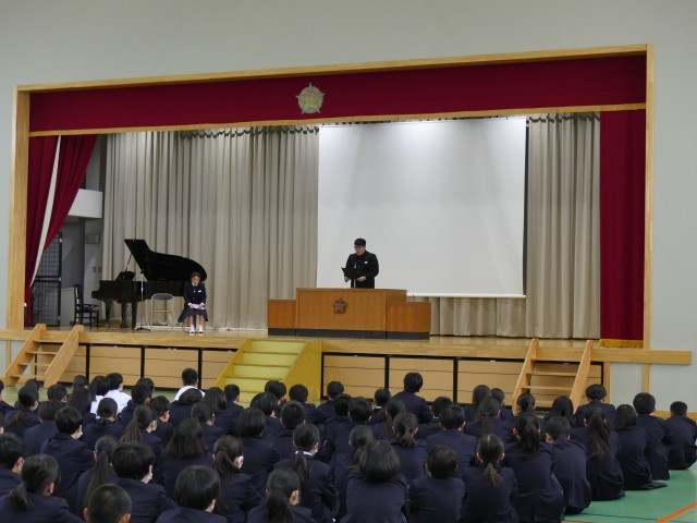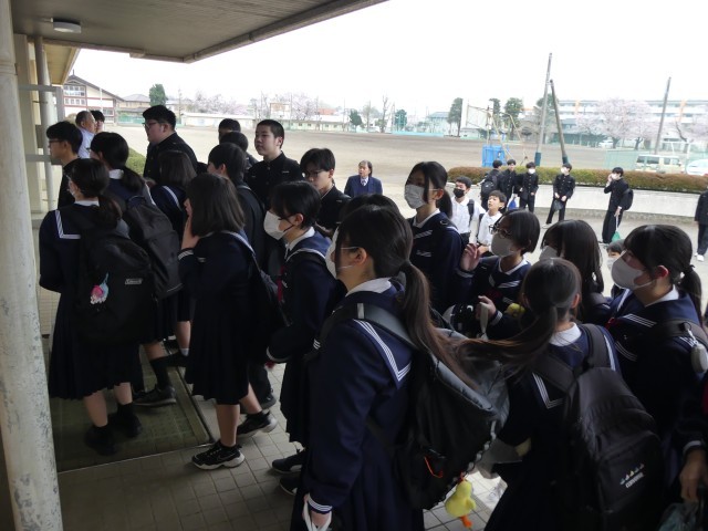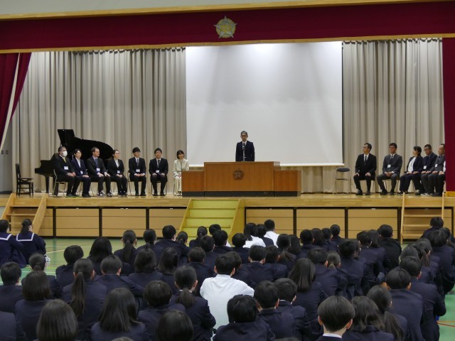 令和8年度がスタートしました。今日は、新任式および始業式を行いました。新任式では、4月より本校に着任した教職員の紹介をしました。新しい先生方を迎え、生徒たちは少し緊張した様子も見られましたが、これから始まる学校生活への期待も感じられました。続いて行われた始業式では、まず生徒代表による新年度の抱負発表が行われました。「学校生活を全力で頑張りたい」「自分と向き合いながら、仲間とともに成長できる一年にしたい」という力強い言葉が述べられ、新たな決意を胸に一人ひとりが前向きにスタートを切る様子がうかがえました。校長先生の話では、「人を大切にしてほしい」というお話があり、友人、先生、家族、そして地域の方々との関わりを大切にしながら過ごしてほしいとの話がありました。新しいクラス、新しい仲間との出会いを大切にしながら、充実した一年となることを期待しています。また、保護者の皆様におかれましては、本年度も本校の教育活動へのご理解とご協力を賜りますよう、よろしくお願い申し上げます。
