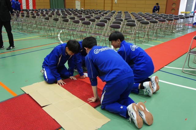 本日は、明日に控えた入学式に向けて2年生と3年生が中心となり会場準備を行いました。体育館では、椅子の配置をはじめ、一つ一つの作業を丁寧に進めました。また、通路や玄関、校内の清掃も行い、新入生を気持ちよく迎えられるよう、心を込めて環境を整えました。準備の中では、上級生としての自覚を持ち、互いに声を掛け合いながら協力する姿が多く見られ、とても頼もしく感じられました。明日は、新入生が新たな一歩を踏み出す大切な日です。在校生・教職員一同、新しい仲間を迎えることを心より楽しみにしています。明日の入学式が、新入生にとって思い出に残る素晴らしい一日となることを願っています。