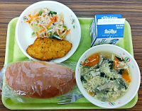 はちみつパン 牛乳 白身魚のバジルフライ 大根サラダ 卵スープ