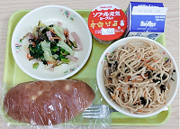 小型オレンジパン 牛乳 きのこスパゲッティ ハムと海藻のサラダ ヨーグルト