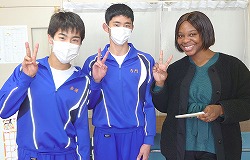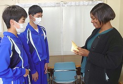 AETのゾーラ先生に,代表の生徒が流ちょうな英語でメッセージカードを手渡ししていたところを写真に撮りました。