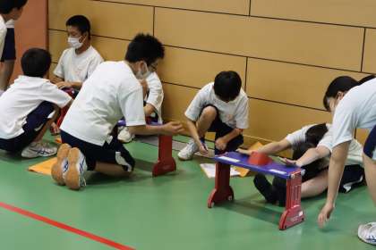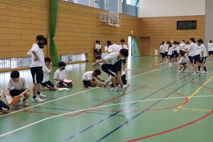 3年生は、体育館で体力テストの測定を行いました。生徒は、担当教諭から「がむしゃらにやるのではなく、考えてやりましょう。手、足、体等、全体の筋肉の動きを考え、目標を立てて取り組むことが大切です。」というアドバイスを受けて、少しでも高い記録を目指していました。