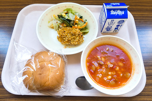 ミルクパン 牛乳 鶏肉のカレーパン粉焼き コーンサラダ 麦入りミネストローネ