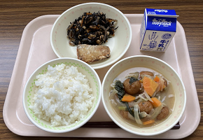 ごはん 牛乳 ニシンの塩こうじ揚げ ひじきと大豆の炒め煮 ヤーコン入り揚げボールと野菜のみそ汁