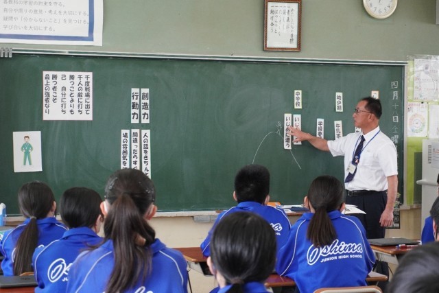 生徒たちは普段とは少し違った授業の雰囲気に、はじめは緊張した様子も見られましたが、校長先生のユーモアあふれる語り口に引き込まれ、真剣に耳を傾けていました。