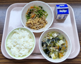切り干し大根入りビビンバ(ごはん、卵入り肉いため、ナムル) 牛乳 わかめスープ