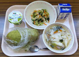 抹茶きなこ揚げパン 牛乳 レモンドレッシングサラダ ワンタンスープ ヨーグルト