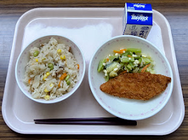 コーンピラフ 牛乳 白身魚のフライ チーズ入り小松菜サラダ