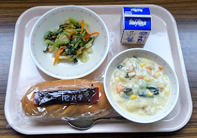 コッペパン チョコクリーム 牛乳 チンゲン菜のクリーム煮 ガーリックドレッシングサラダ