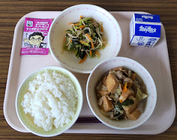 ごはん おかかふりかけ 牛乳 豚肉と厚揚げのみそいため わさびあえ
