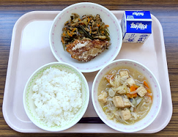 ごはん 牛乳 めばるの竜田揚げ 茎わかめ入りきんぴら 切干大根のみそ汁